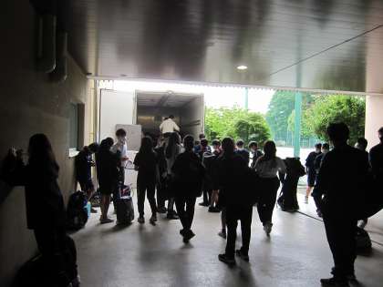 3年生が修学旅行の荷物をトラックに積み込んでいます。
