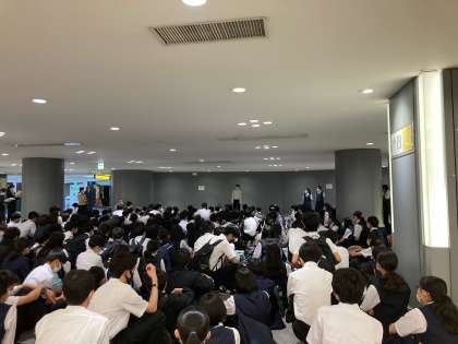 3年修学旅行隊、定刻通り出発式を開始しました。