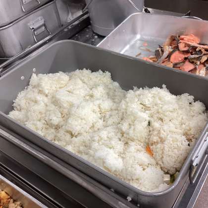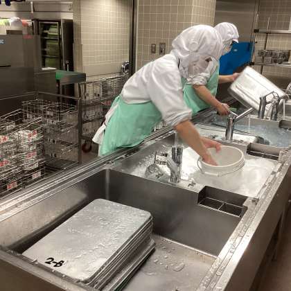調理作業が終わっても、午後は洗浄作業があります。子供たちが給食を安全に美味しく食べるためには、きれいな食器が必要です。洗浄機はありますが、水で流すことしかできないので、洗剤をつけてこするのは手作業です。1日あたり3種類×700人分なので、2100枚のお皿を洗うことになります。そこにお盆、トングやお玉、食缶なども加わります。調理員さんに感謝の気持ちが伝わるよう、ご飯粒まで残さず食べる、お皿やお盆をそろえるなど、きれいな片付けを心がけてくださいね!