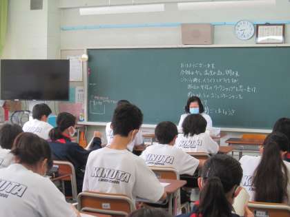 1年生、昨日のいじめ防止プログラムで学んだコミュニケ—ションを生かしていこうと担任のメッセージがあります。