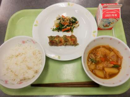 今日はカレー粉で風味づけをした「カレー肉じゃが」です。白ご飯によく合うと先生方に好評でした。たくさんのクラスで、よく食べてくれていましたが、ご飯が少し多めに残っていたこと、クラスによっては肉じゃがも多めに残っていたことから、全体的にボリュームがあったのかもしれません。次回は「肉じゃが」の芋の量を減らしたいと思います。また、食べる時に少し固っく感じる芋もありました。「肉じゃが」などのじゃが芋メインの料理では、多少煮崩れるくらいやわらかくした方が、子供たちも美味しく食べることができると思うので、次回はそうなるよう努力したいです。