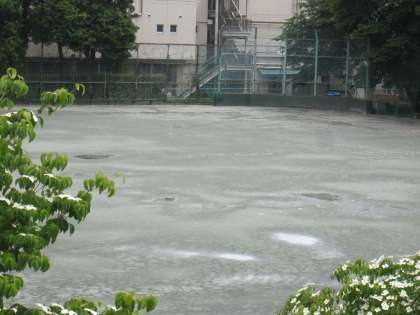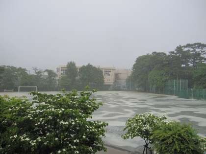 写真2枚目 昼休みの校庭 雨はやみましたが、遊べるコンディションではありません。