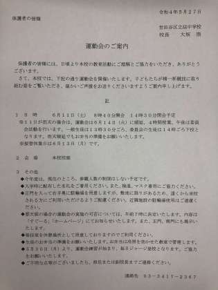 本日、「運動会のご案内」を配布しましたので、ご確認いただければ幸いです。