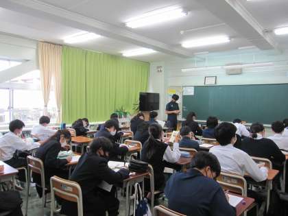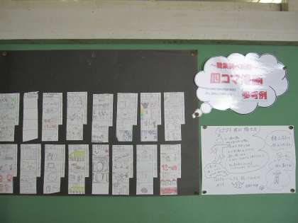 1年生の廊下には4コマ漫画についてのアドバイスが掲示されています。(副校長)