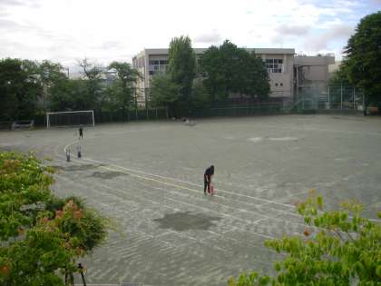 早く来た先生たちが、校庭の水たまりの水取りや砂入れ、線引きなどを行って、予行演習ができるように準備しています。
