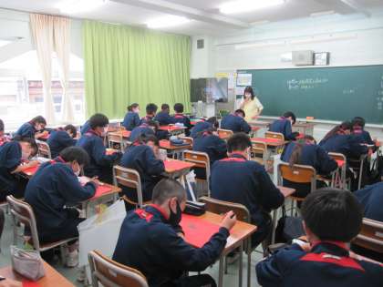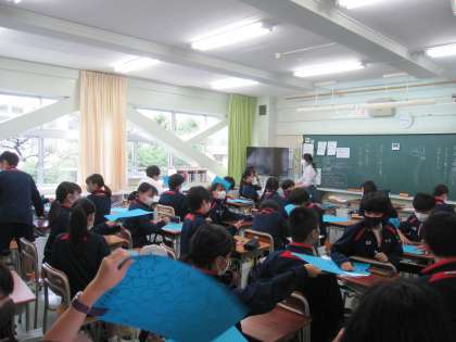 運動会を振り返って、クラスの仲間のがんばっていたところを1枚の画用紙に寄せ書きしました。この用紙は運動会前に各クラスの有志が作成したものです。自分の気づかなかったことを褒めてもらえると嬉しいですね。