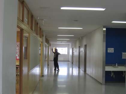 3学年の教員が、朝の教室の様子を巡回して確認しています。