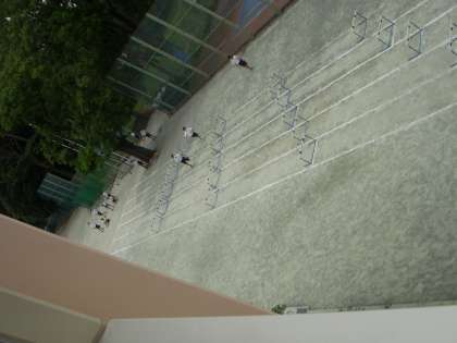 ハードルの授業、先生がストップウオッチで時間を図っています。