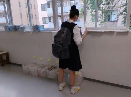 教科係の生徒が提出物を出席番号順に並べています。ご苦労さまです。