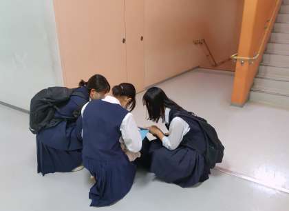 職員室前で教科書を見直している生徒たち、今日出題されたところを確認しています。疑問に思ったところをすぐに見直しているところがさすがです。