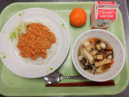 砧中の給食のタコライスは、ご飯に茹でて冷やしたキャベツを添えて、上からミートソースをかけます。ミートソースの中に、5ミリ角のダイスチーズが入っており、粉チーズよりも強いチーズの味を感じます。ご飯とミートソースの安定した美味しさと、時々感じるキャベツとチーズの味で、飽きの来ない美味しさに仕上がりました!