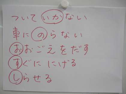 昨日、区教委からすぐーるでお知らせしました通り、不審者対応では生徒に「いかのおすし」を伝えています。(副校長)