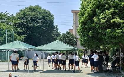 体育の授業の前は教員がテントやミストシャワー、ミスト発生機の準備を行っています。