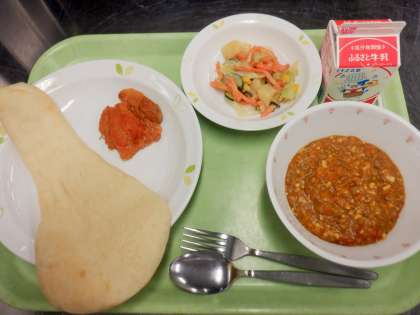 また、今日のパンは「ナン」です。本場インドの食べ方と同じように、カレーにつけて食べることができます。子供たちは嬉しかったようで、これまでのパンの中でも、残菜はとても少なかったです。