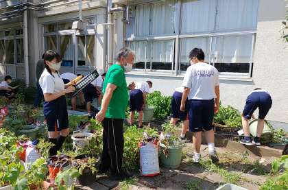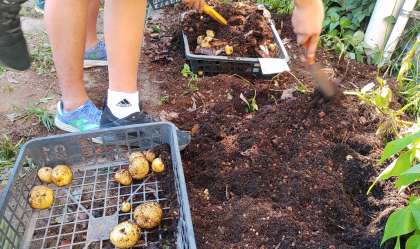 バケツをひっくり返して、ふかふかの土から出てきたジャガイモをみんなで収穫しました。時々虫が出てきて、びっくりなんてこともありました。(副校長)
