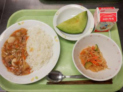 サラダは、春雨のツルッとした食感と、シャキシャキのもやし、きゅうり、人参と、ハムのうま味が混ざって美味しかったのですが、生徒たちが食べる頃には、この気温で少しぬるめになってしまったことが残念です。冷たければ、もっと美味しいのですが。そこを予測して、もう少しドレッシングにしょうゆと酢を入れて、しっかり目に味を付けるべきだったと反省しました。ですが、ありがたいことに子供たちはサラダもよく食べてくれていました!