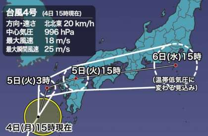 台風4号は、4日(月)15時現在、東シナ海を北北東に進んでいます。今後、温帯低気圧または、熱帯低気圧に性質を変えながら西日本を東に進んでいく見込みで、関東は6日(水)が大雨となりそうです。