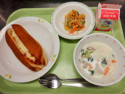 今日のパンは、豚ひき肉、大豆と野菜のみじん切りを炒めて、トマトピューレとケチャップなどの調味料を加えて作った具をサンドしています。野菜と豆の栄養がしっかりとれます。最後に、上にチーズをのせて、オーブンで焼き上げました。美味しかったのですが、もう少し味を強くした方が中学生向きかなとも思いました。「チリビーンズドッグ」という名前に負けないように、次はチリパウダーを増やして、もう少しスパイシーな仕上がりにしてみようかと思います。