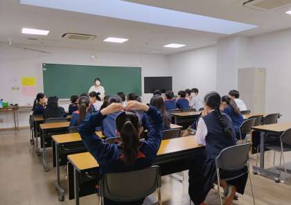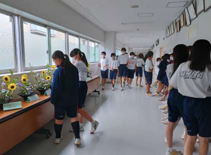 先生に暗唱を聞いてもらうために待っている人たち、3年生の部会を開いている部、多目的ホールでくつろぐ人たち…