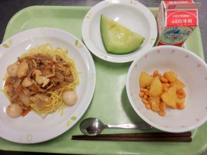 夏休み前の最後の1週間が始まりました。来週は2日しかないので、今週がんばれば夏休みが待っています。土日で休んで今日は元気よく登校!と行きたいところですが、この暑さだとなかなか調子も上がらないかと思います。週明けは少しでも食欲が進むようにと、あんかけそばにしました。野菜と豚肉、えのき、そしてうずら卵といかが入っています。味付けは塩、こしょう、しょうゆ、酒、そして最後に酢とごま油を加えています。肉と野菜、きのこ、魚介のうま味も出ているので、奥深い味わいになっています。これまで、麺系は喜んでくれるけども残菜が多い、という傾向でした。そこで、今日は麺の量を少し加減してみましたが、「この暑さだし、たぶん残るだろうなあ」という思いでいました。ところが、今日の残菜率はたったの4%!週明けでここまで食べてくれたのは予想外でした。調理員さんが美味しく作ってくれたことで、子供たちの心をつかんだのかもしれません。また、担任の先生のおかわりの呼びかけなど、学校全体の協力もあってこその結果だと思います。