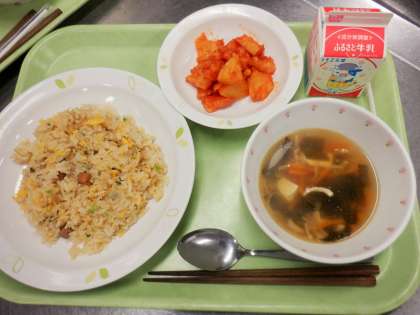 今日はチャーハン、いかとじゃが芋のチリソース、わかめスープです。チャーハンは、前回味が薄く感じたので、今回は具だけでなく、お米を炊飯するときにも醤油を入れてみました。しかし、それでも少し薄く感じます。給食のチャーハンは、主食としておかずと組み合わせて食べるため、そこまでしっかり味を付ける必要はないのですが、それでももう少し味をしっかりさせた方が、子供たちも美味しく食べられると思います。給食の塩分量の制限は厳しいため、濃くした方がいい料理、薄くしてもいい料理を見極めながら、次回調整したいと思います。