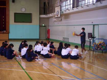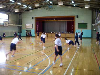 1年生女子、雨でプールの授業ができないため、体育館でのバレーボールに。