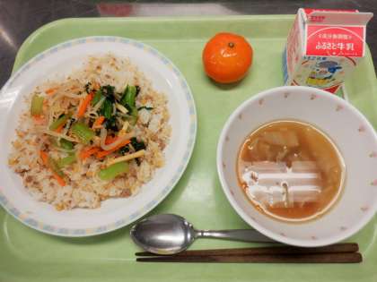 1学期最後の給食は、ビビンバ、春雨スープ、冷凍みかんです。ビビンバはあらかじめ豚ひき肉と炒り卵をご飯に混ぜてあるので、教室では上に野菜をのせて配膳するだけです。野菜には砂糖、みりん、酒、しょうゆ、コチュジャン、ごま油で味付けしてあるので、野菜と一緒に食べることでビビンバの美味しさを味わえるようになっています。さらに野菜は冷やしてあるので、夏でも食べやすいです。このメニューは野菜が多めにとれるヘルシーな献立ですが、その分カロリーも低く、なかなかエネルギー量が確保できません。そこで、前回5月に実施したときよりもお米を1kg増やしました。また、味にクセがあるように感じたので、コチュジャンの量も少し減らしました。それが裏目に出てしまい、今日はビビンバはお米が14%、野菜も10%とけっこう多めに残ってしまいました。次回は、お米の量は増やさないようにし、味付けも元に戻したいと思いました。しかし、この日は牛乳もいつも以上に多く残っていました。おそらく、欠席者数も多かったのだと思います。
