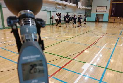 体育館の暑さ指数は28.4度です。冷房が効いた部屋も確保して休憩できるようにします。(副校長)