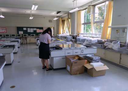 コロナ下で使用していなかった備品を確認し汚れを落としたり、使えないものを処分したりしています。3年ぶりに調理実習が行えるよう、必要なものを揃えていきます。(副校長)
