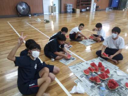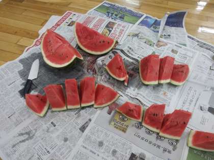 (写真は11、12日の第二次スイカ大会?のもの。12日夜の天体観測は天候がよくないため残念ですが中止としました。)