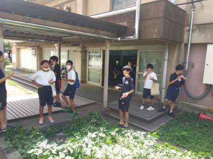 剣道部は週3〜5回(選択制)朝8時30分〜11時30分の稽古を行っています。夏休み前半の稽古では初心者は素振りと小手、面、胴打ちの基本の形の練習、経験者は基本打ちに加え、【出がしらの技】【一本を狙う技】の練習を行いました。漫然と稽古をするのではなく、毎日、【今日はこれをやるのだ】という目的を持って練習に励めたかな?