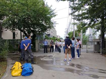 いざという時、近隣の方々にも提供できる水の確保は大切なことです。給食物質班の方々が熱心に質問しながら設置方法を体験していました。(副校長)