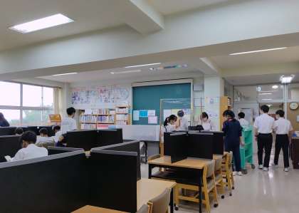 図書館は、本の返却の生徒もいて、図書委員は大忙しです。(副校長)