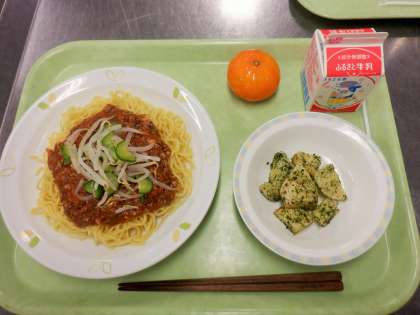 2学期最初の給食は、ジャージャー麺、青のりポテト、冷凍みかんです。夏休みが終わったのは少しさみしく感じるかもしれませんが、学校には給食があります。これからも、給食を楽しみに、元気に登校しましょう!