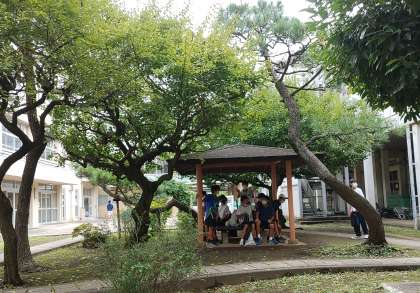 男子テニス部の練習が終わり、東屋でほっと一息入れています。この後ミーティングをして下校しました。(副校長)