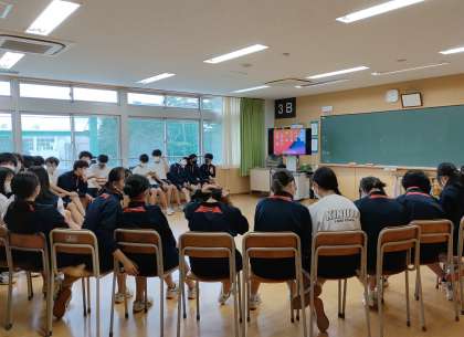 教員が夏休みに研修した人間関係づくりプログラムから、各学年にあったものを実戦しています。写真は2年生と3年生です。