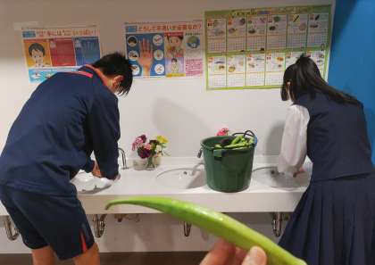 今年の夏、農業部が丹精込めて作ったナスとオクラが今日の給食に登場します。