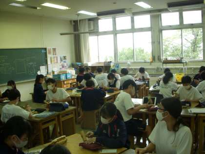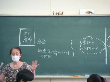 ふと美術室をのぞくと2年生が「錫」の板を木槌でたたいて、作品を作っているところでした。