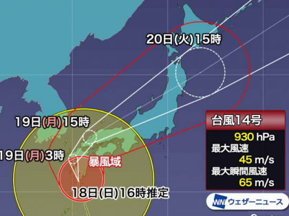 台風14号は九州に接近・上陸後、19日(月)の午後以降は東寄りに進む予想となっています。