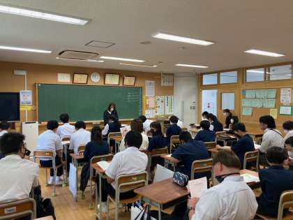 I組は中間考査を一足早く終えて、明日から始まる連合移動教室に向けて、事前指導を行っています。