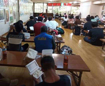 宿舎で作っていただいたお弁当をみんなで食べています。