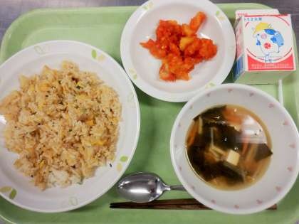 どれも満足いくような味でした。今日は、職員室の給食が残ったため、私自身1人分よりも多めに食べましたが、それにより「チャーハン」と「いかチリ」の食べた後の満足感が大きく、また、たくさん食べるほど油とコクがお腹に重くひびいてくることに気付かされました。子供たちもきっと、「おかわりをしてたくさん食べる」ということが難しいのではないかと思ったところ、やはり残菜はそこそこの量が残ってきました。そこで、次回はチャーハンのお米の量を少し減らし、チリソースのじゃが芋の量を減らすことでボリュームダウンをはかり、さらにソースのごま油の量を減らして油っこさを少なくしたいと思います。