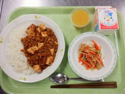 今日は久しぶりのマーボー豆腐ご飯です。世田谷区では安全な給食づくりのために、「5〜9月は大量に豆腐を使うメニューは禁止」というルールがあります(豆腐は傷みやすいため)。調理室は冷房が付いていますが、それ以上に熱源となる厨房機器が多いため、気温、湿度ともにけっこう高くなります。そのため、マーボー豆腐は夏場は避けていたので、5月以来の登場となります。