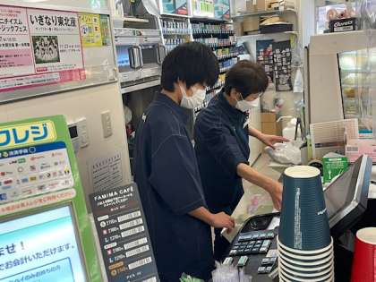 初めての体験に緊張感が感じられます。(体験先:ファミリーマート成城学園前店)