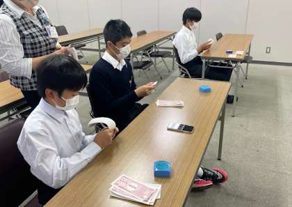 お金を数える練習に集中して取り組んでいました。(体験先:きらぼし銀行)