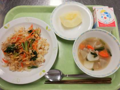 ビビンバは世界的に有名な韓国料理ですね。韓国では、古い食材を新年には持ち越さないという風習があり、年末に野菜や肉などをご飯と混ぜて食べたことから「ビビンバ」という料理が生まれたそうです。通常なら、ご飯の上に野菜、豚肉、卵と盛り付けますが、給食ではあらかじめ「そぼろ肉」と「炒り卵」をご飯に混ぜて、上に野菜を盛り付けるだけにしました。