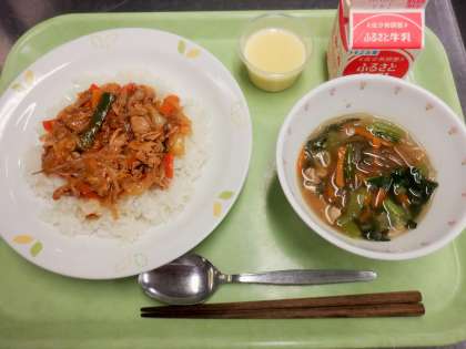 今日は豚キムチ丼です。人気のメニューですが、意外にも低カロリーなので、カロリー確保のためにどの料理と組み合わせようか、いつも頭を悩ませています。サラダとスープと3品にするとボリュームが多くなるし、かといってスープをコッテリとした高カロリーの物にしたり、じゃが芋を入れたりすると、それもまたお腹がいっぱいになりやすい。そのため、いつもスープとデザートの組み合わせにしています。