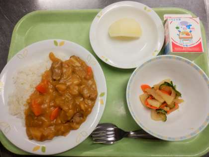 今日はカレーライスです。昨日、一昨日と1年生のA・B・Cクラスが河口湖の移動教室を行い、明日、明後日はD・E・Fクラスが移動教室を行います。ちょうど合い間である今日は、1年生も含めて全生徒が久しぶりに給食を食べるので、気合を入れてカレーライスを作りました。ただ、あとからわかったのですが、移動教室先の食事でもカレーライスがあったそうです(笑) 来年度は、カレー以外の人気メニューにしてあげようと思いました。