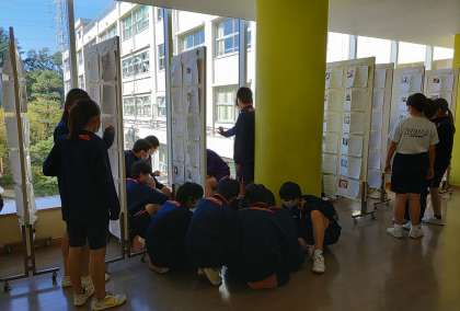 多目的ホールでは、作品を眺める人と展示パネルの間で将棋をする人とで賑わっています。(副校長)