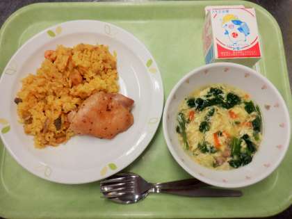 今日は鶏肉、野菜、トマトと いか、えびを混ぜ込んだ美味しいパエリアと、前回大人気だった鶏肉のマーマレード焼き、そしてほうれん草と卵のスープです!
